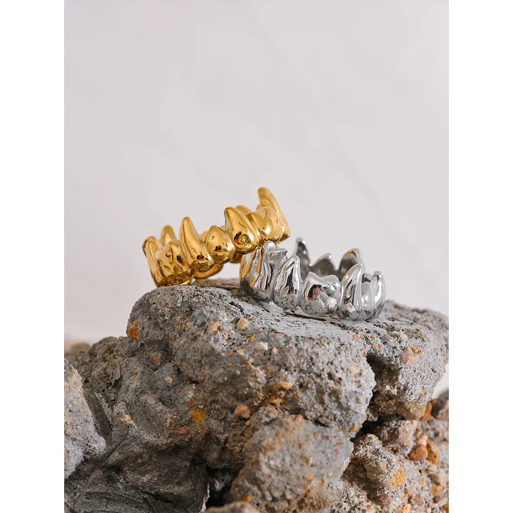 En unik ring med en design som påminner om tänder, där varje detalj fångar en kraftfull och modern estetik. Ringens strukturerade form skapar en dramatisk och iögonfallande look, perfekt för den som söker något annorlunda och trendigt. Ett statement-smycke som verkligen sticker ut.