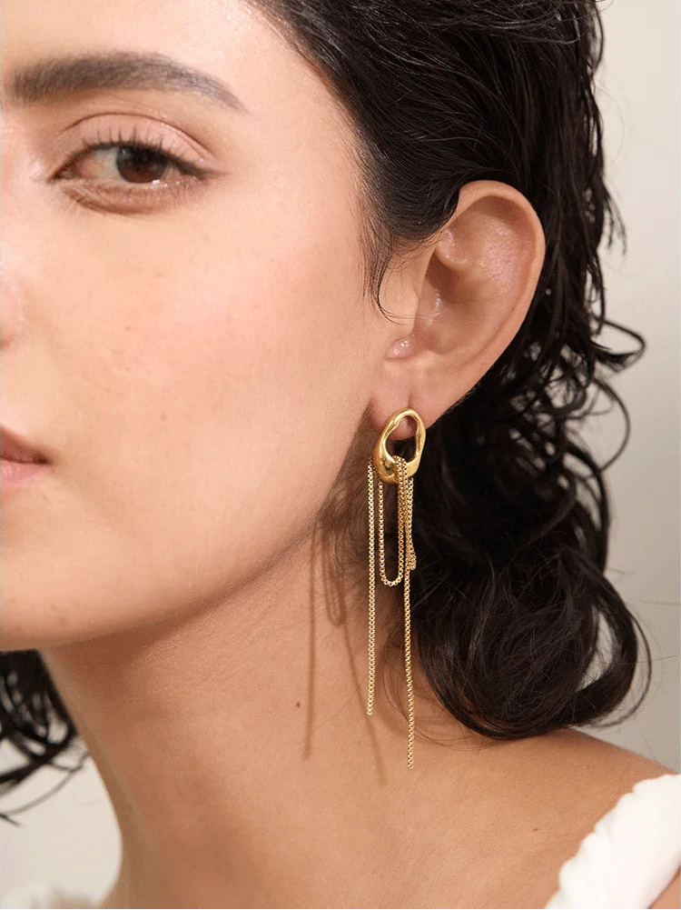 Ett elegant örhänge med hängande kedjor som ger en dynamisk och sofistikerad look. Kedjorna rör sig vackert med varje rörelse och skapar en känsla av rörelse och liv. Perfekt för att addera en modern och iögonfallande touch till din stil. Finns i både guld- och silverplätering.