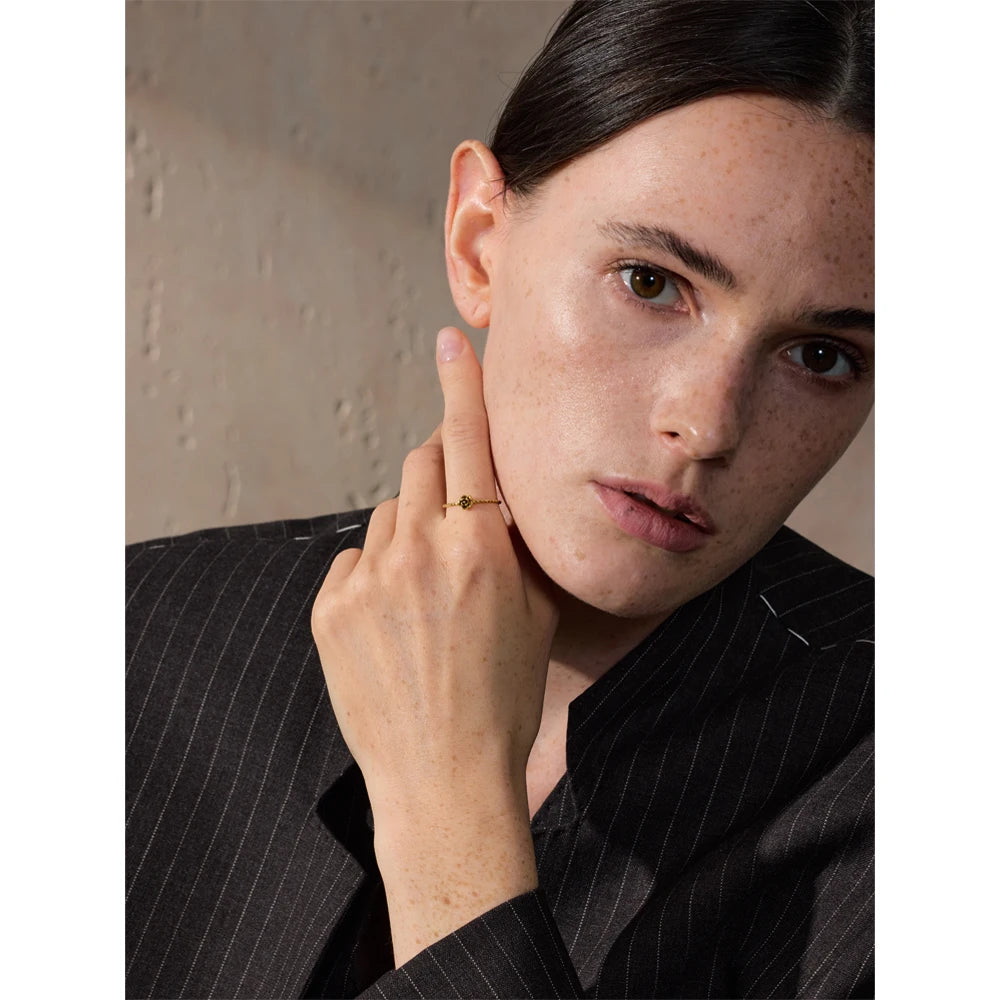 En ring med en elegant twistad design i guldplätering som omsluter fingret på ett vackert och stilfullt sätt. Ringen har en ros som ger den en romantisk och sofistikerad touch. Guldpläteringen ger en lyxig och tidlös känsla, medan rosen ger den en extra detalj av skönhet och charm.