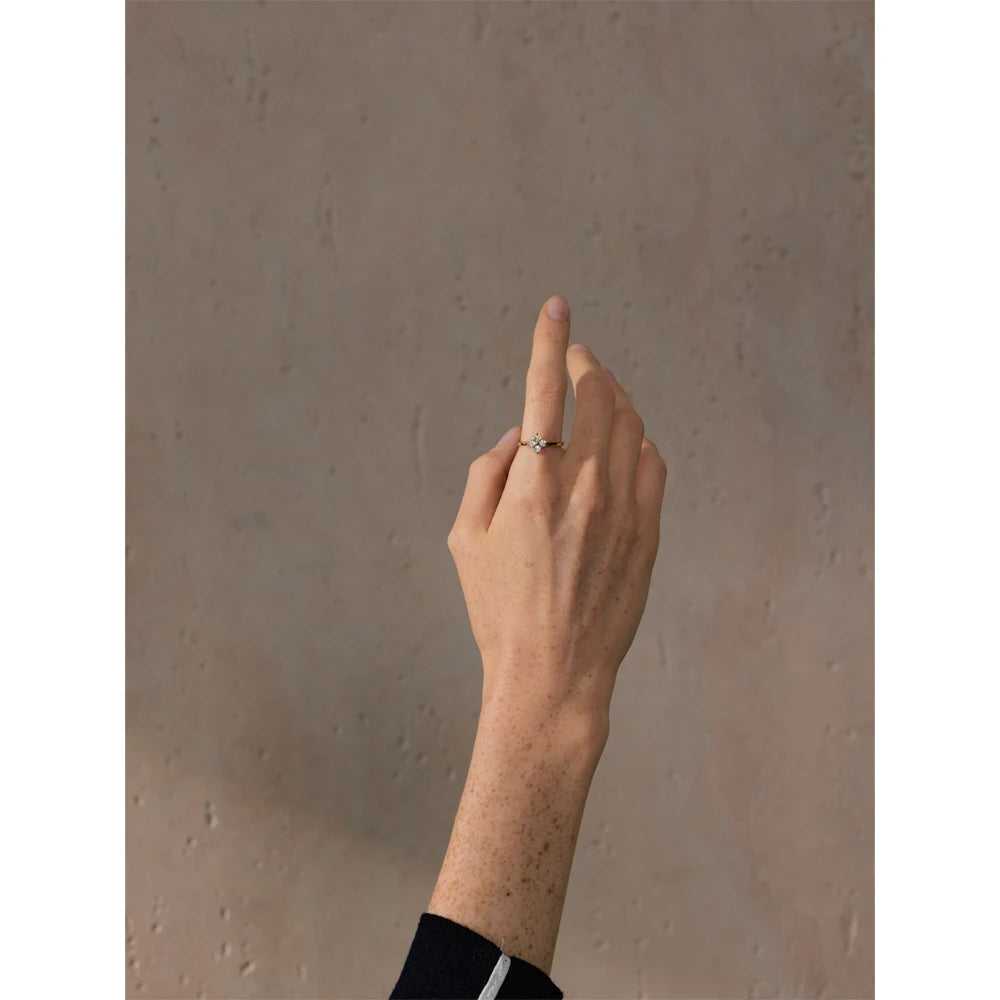 Ring med en blomma av Zirkonia stenar, pläterad i guld. En elegant och funklig design som ger en lyxig och feminin känsla.