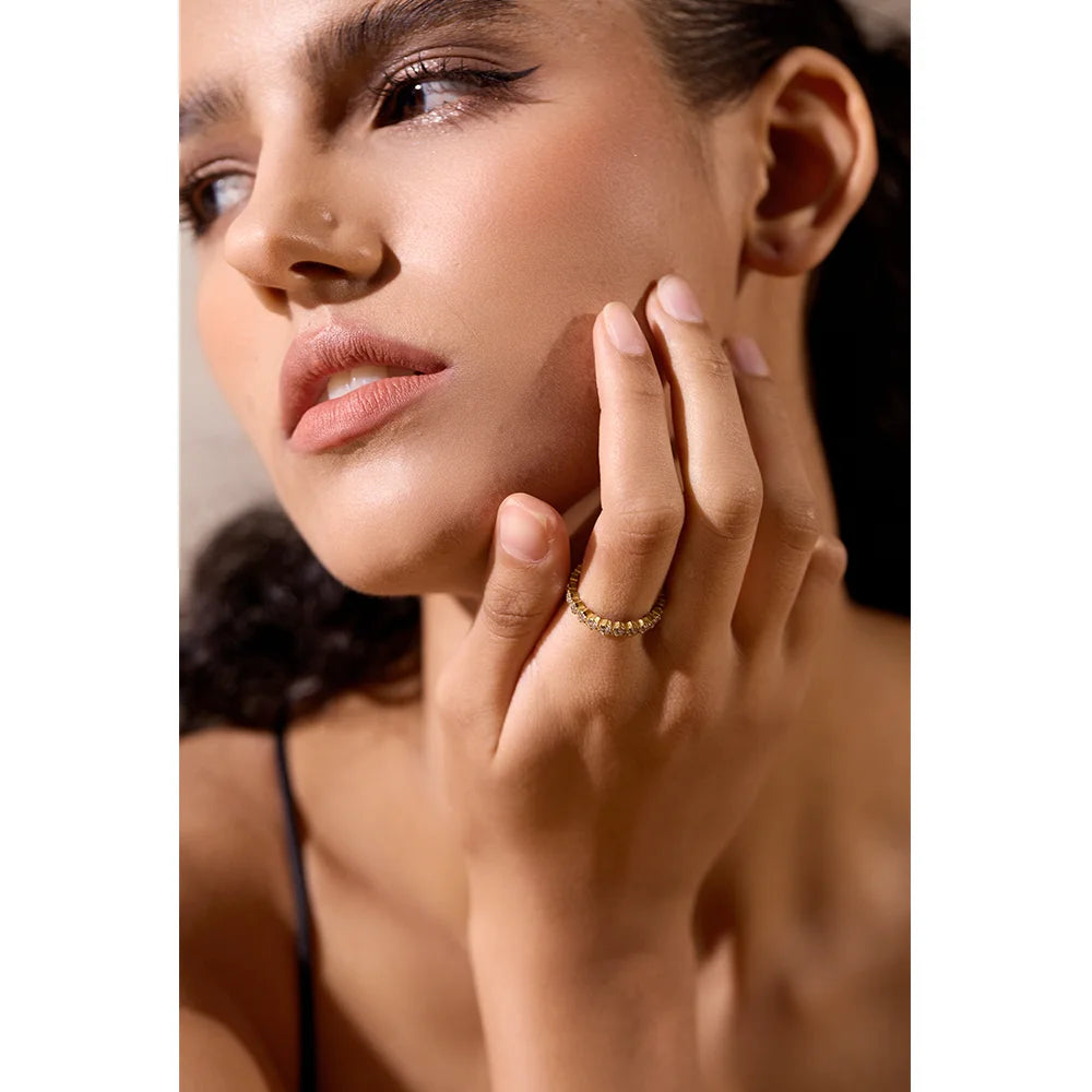 Gemova-ringen, en kundfavorit som är fylld med glittrande Zirkonia stenar, vilket ger ett fantastiskt lyft till varje look. Den finns pläterad med äkta 18k guld eller silver, vilket ger en lyxig och sofistikerad känsla. Perfekt för den som vill ha något glänsande och iögonfallande.