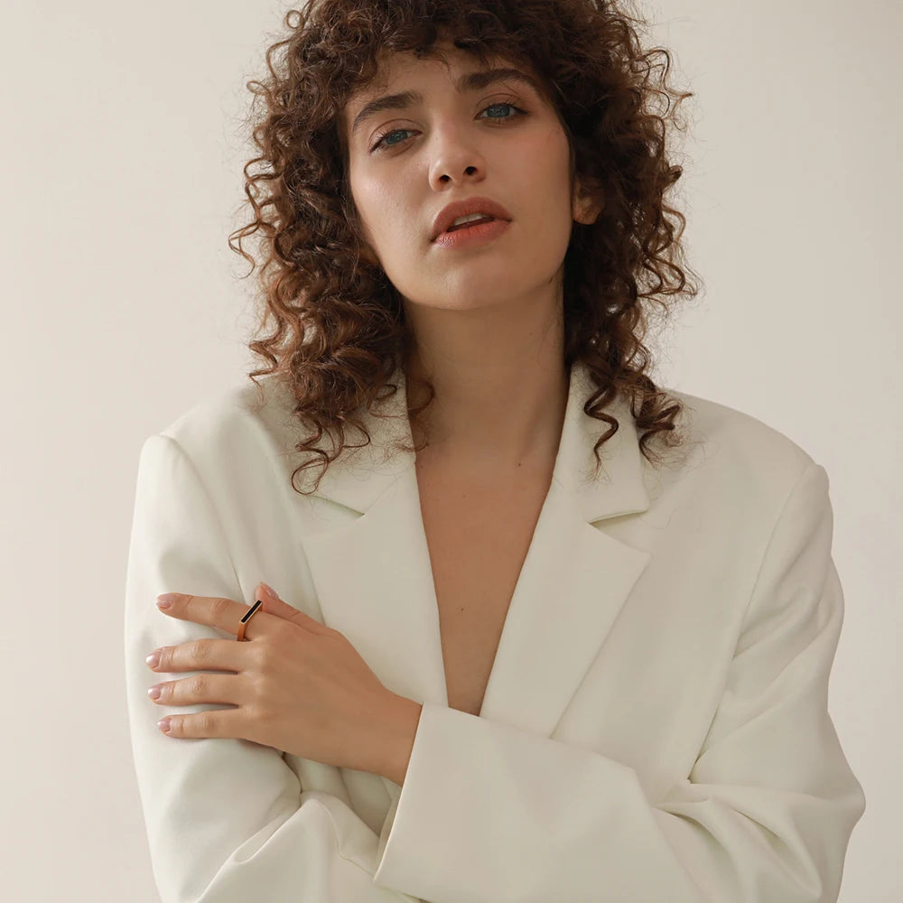 En sofistikerad fyrkantig ring 18k guldpläterad och prydd med en elegant svart sten som ger smycket en modern look. Den geometriska designen kombineras med den djupa, svarta stenen för att skapa en ring som både är tidlös och iögonfallande.