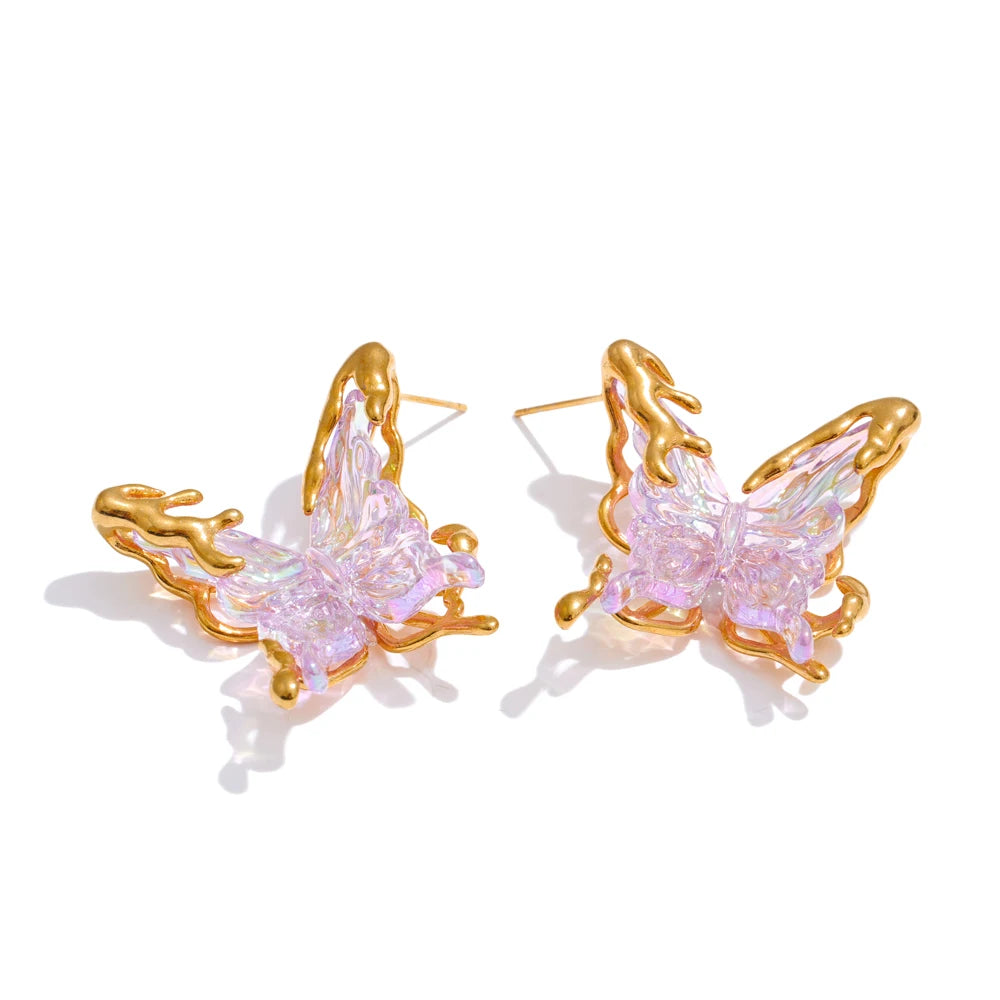 Mycket fina örhängen med en fjäril formad av klart glas som fångar ljuset på ett magiskt sätt. Utsidan är pläterad med äkta 18K guld för en lyxig finish som lyfter hela designen. Ett elegant och lekfullt smycke som passar alla tillfällen.